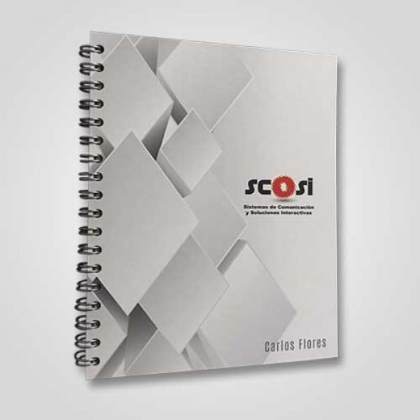 Cuaderno CorporativoPasta dura impresa a todo color100 hojas papel bondTamaño 1/2 cartaWire'o metáli..