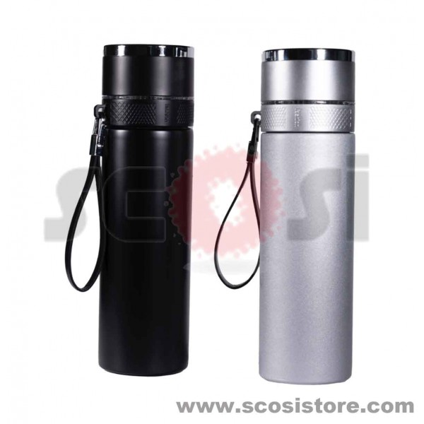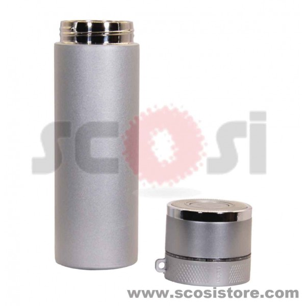 Termo fabricado en acero inoxidable de grado alimenticio, con doble pared y aislamiento al vacío. Cuenta con un mecanismo de apertura mediante un botón ubicado en la tapa.