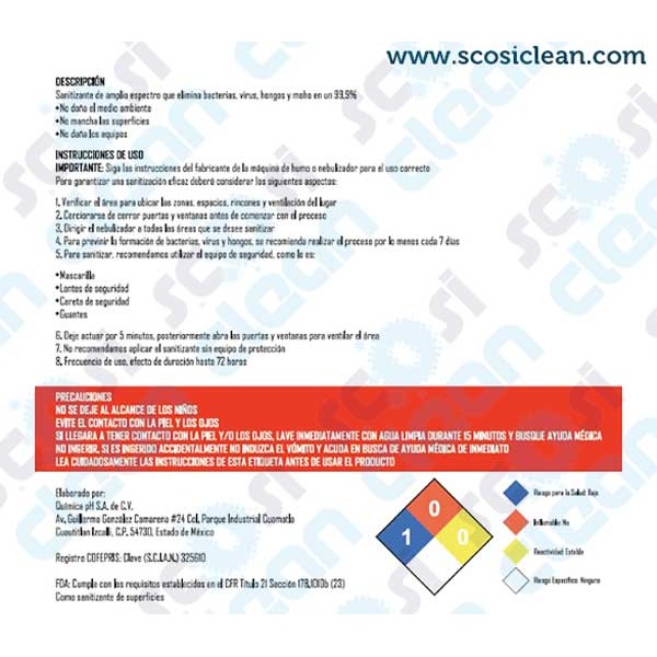 Sanitizante de amplio espectro que elimina bacterias, vitus, hongos y moho en un 99%.Contenido: ..